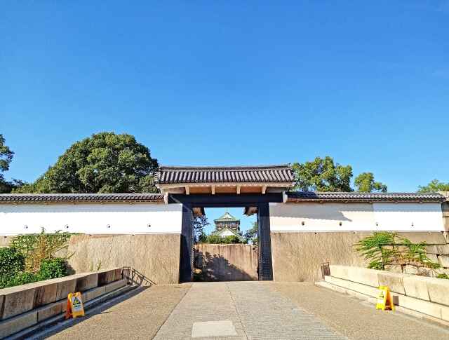 門の間から天守閣が見えるのが特徴で、大阪城の中でも大きな人気を誇る撮影スポットです。