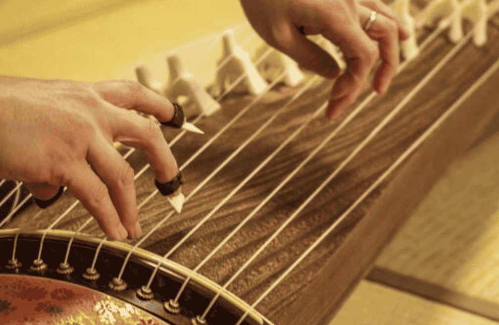 The koto is played by adjusting the pitch of the strings with a movable bridges and plucked using three fingerpicks.