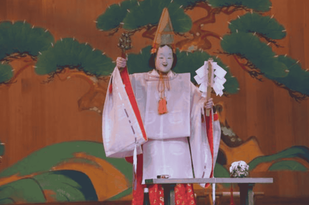 In Noh, a story is told by a narrator called a utai, a musical ensemble called a hayashi, and a leading actor called a shi-te, who wears a Noh mask and dances to perform the story.